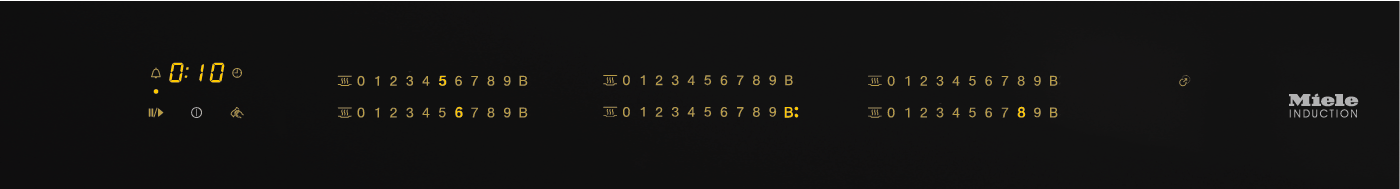 Технология FullSurface. Интеллектуальное распознавание посуды. При перемещении посуды подсвечиваются цифры уровня мощности, соответствующие расположению посуды