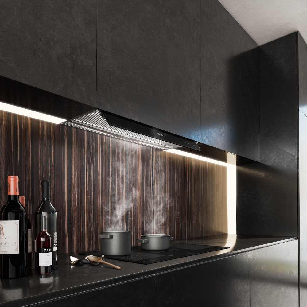 Увеличенная зона аспирации, наклонные жироулавливающие фильтры с направляющими, поддон для конденсата, увеличенный козырек из закаленного стекла с нагревательным элементом, сенсор на стекле, таймер, LED,